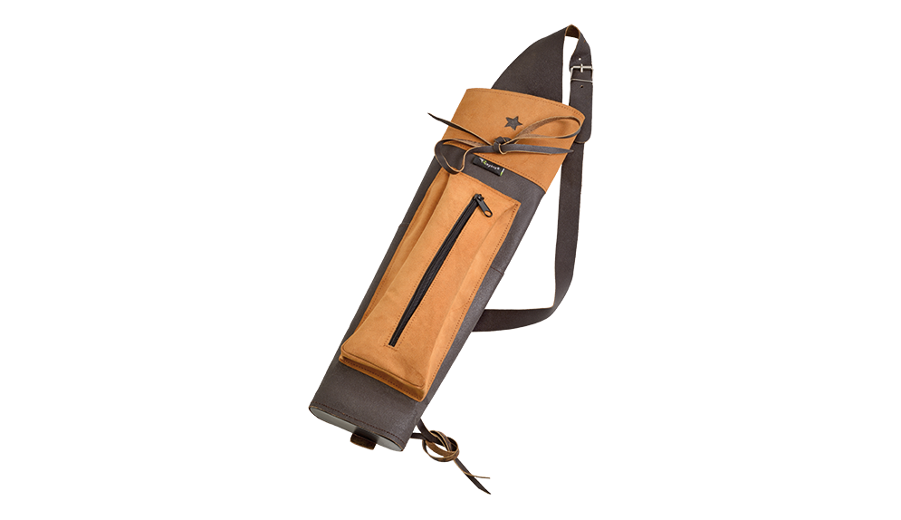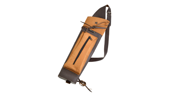 20” traditional back quiver made of durable leather. Adjustable length strap. Large, zippered accessory pocket. Reversible for RH or LH use.